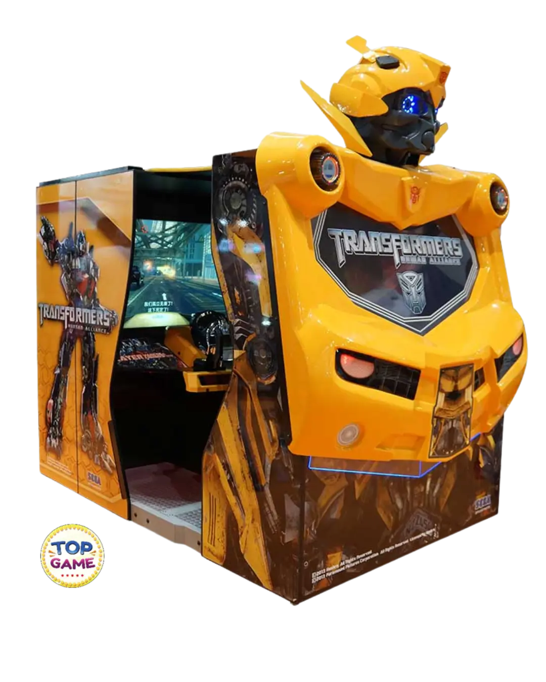 Transformers: Human Alliance (Versão Cabinada) é um espetáculo visual e sonoro que coloca os jogadores no meio da guerra entre Autobots e Decepticons. Produzido pela SEGA, é uma das máquinas mais icônicas do gênero shooter cooperativo — e o design frontal no formato do Bumblebee já garante atenção imediata no seu ponto comercial.