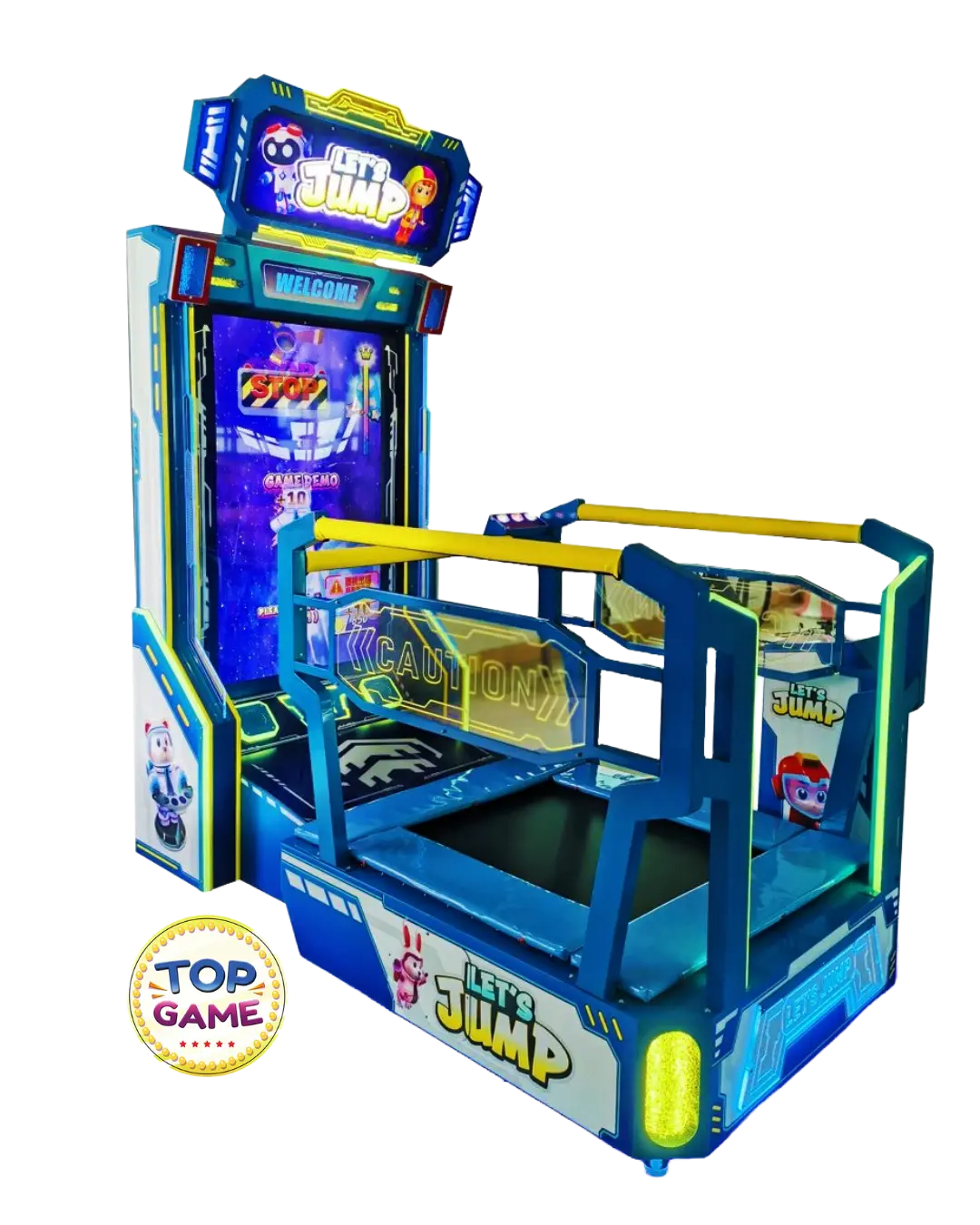 O Let’s Jump é um arcade revolucionário que transforma um trampolim físico em um controle de jogo. A criança pula sobre o trampolim real, e seus movimentos são detectados em tempo real pela máquina, controlando o personagem na tela! É diversão, exercício e imersão total em uma experiência segura, vibrante e tecnológica!