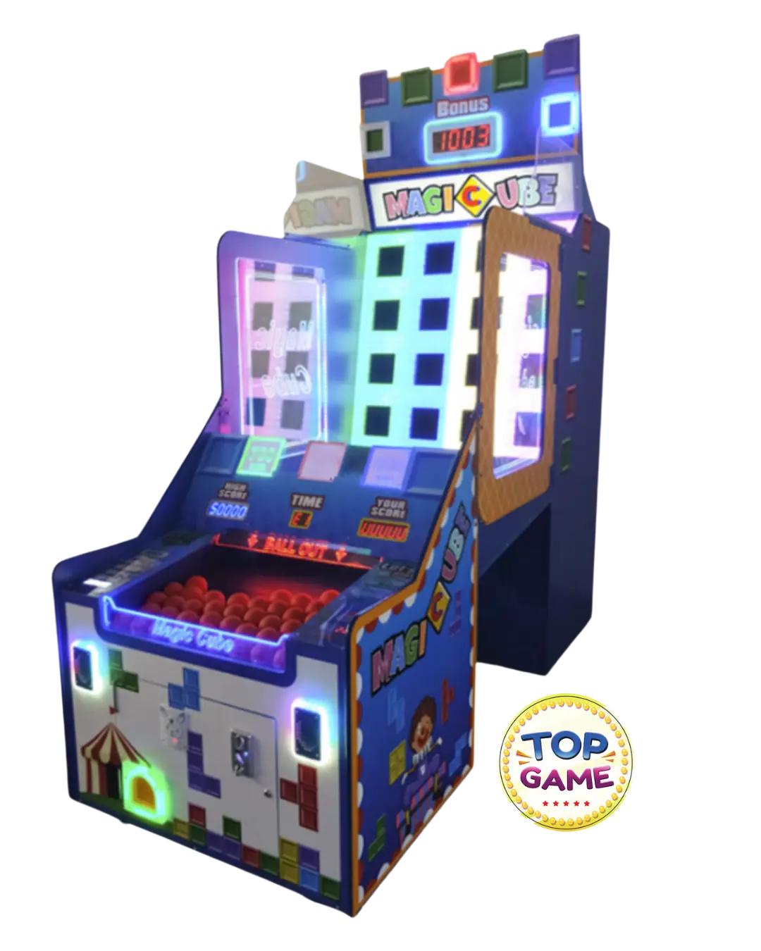 O Magic Cube é uma máquina arcade interativa que desafia o jogador a lançar bolas nos alvos luminosos no painel em tempo real. A cada acerto, os blocos “mágicos” se iluminam, somam pontos e criam uma experiência visual envolvente. Com design colorido e gameplay dinâmico, ele é perfeito para atrair crianças e adultos em busca de diversão rápida e recompensadora.